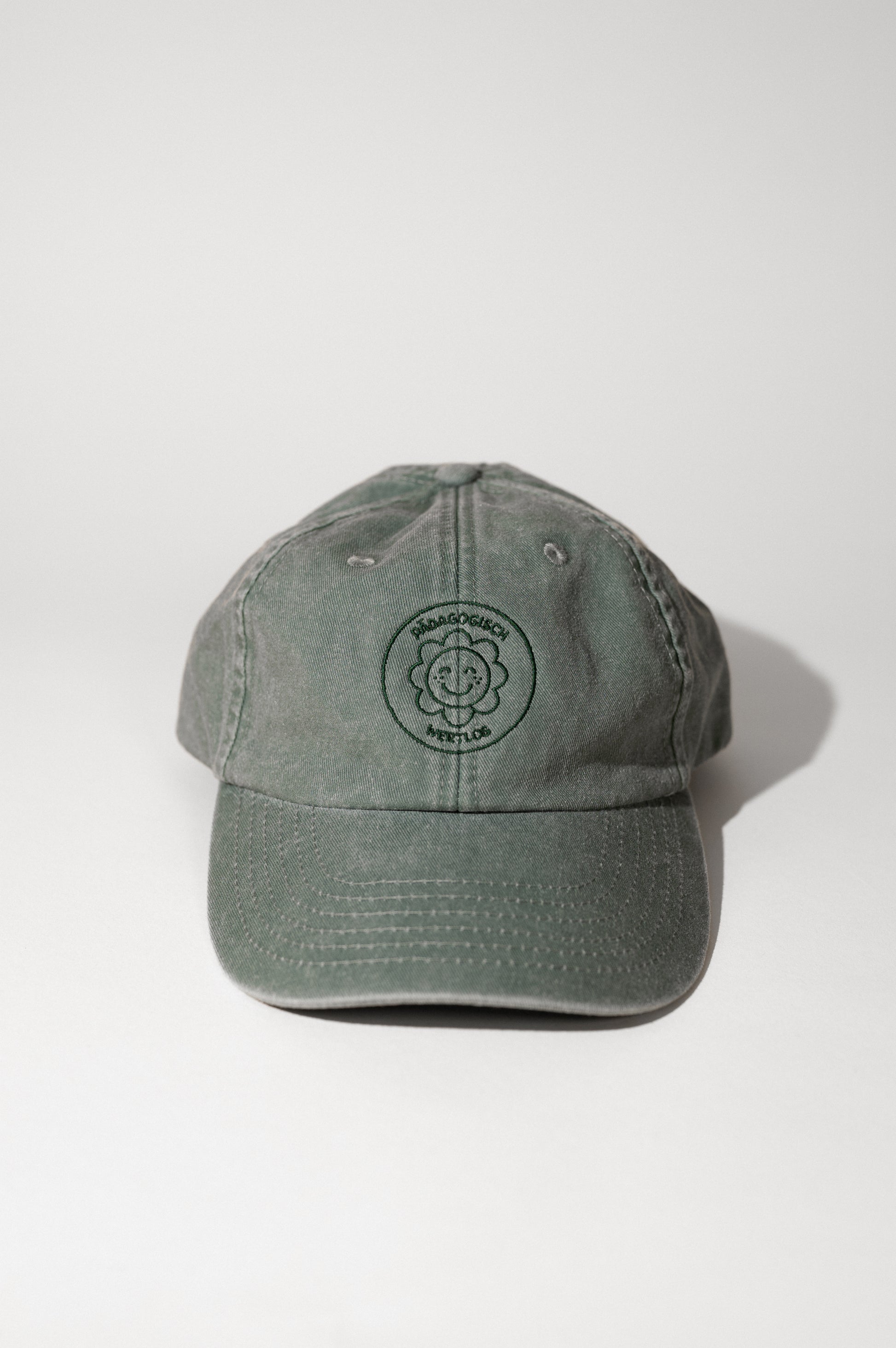 Die grüne „pädagogisch wertlos“-Cap im Used Look kommt mit cuter Blumenstickerei in Dunkelgrün.