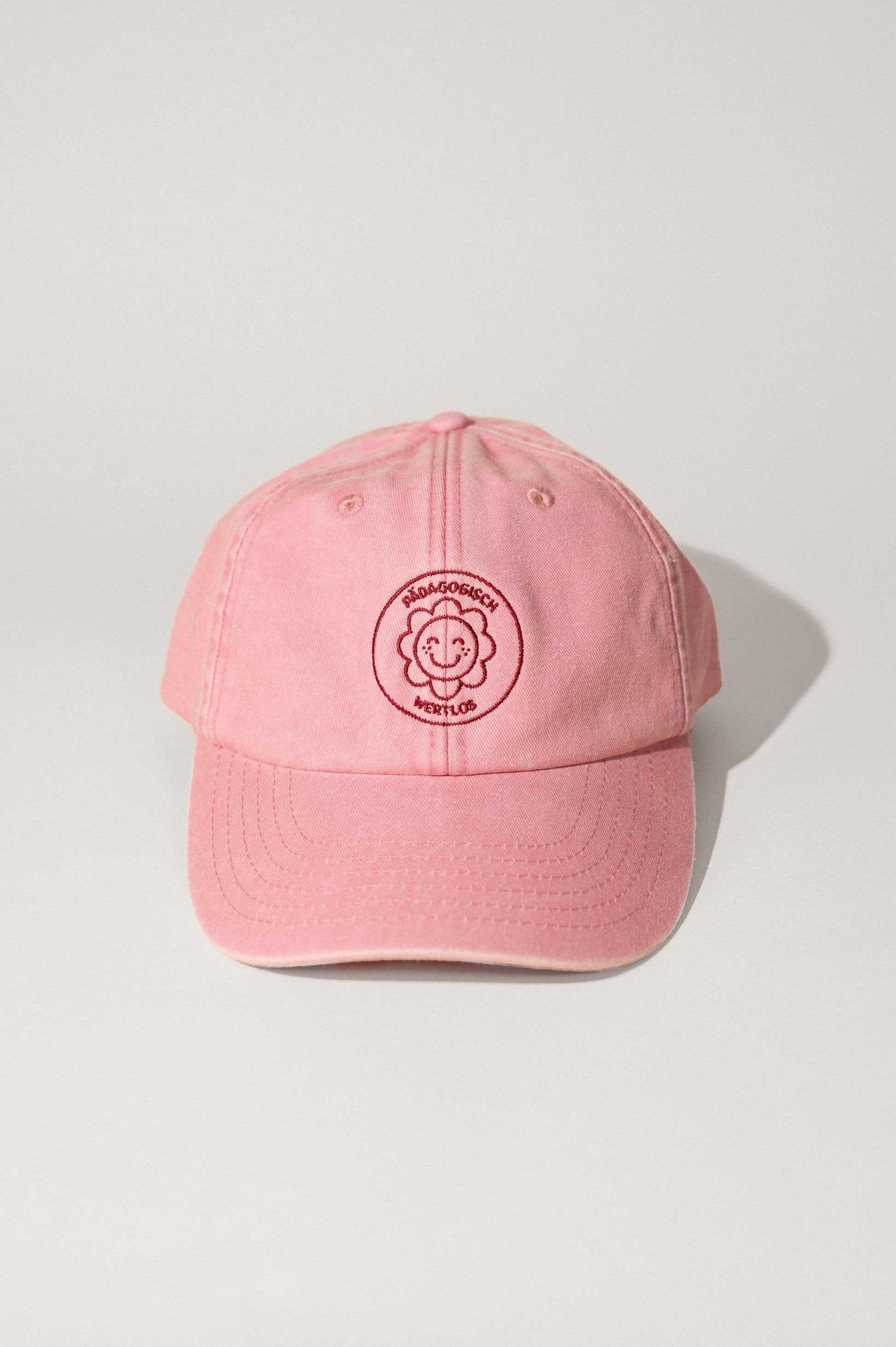 Die rosa „pädagogisch wertlos“-Cap im Used Look kommt mit cuter Blumenstickerei in Bordeaux. Ein